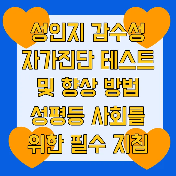 성인지 감수성 , 혹시 나도 부족할까 걱정되시나요? 🤔 사회 구성원으로서 꼭 갖춰야 할 필수적인 덕목인 성인지 감수성! 자가진단 테스트를 통해 나의 수준을 점검하고, 실질적인 향상 방법을 알아보세요. 성평등 사회를 향한 의미있는 발걸음, 지금 바로 시작하세요! 🚀 #성인지감수성 #자가진단 #성평등 #필수지침