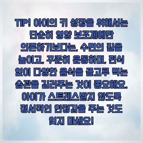 💡 TIP! 아이의 키 성장을 위해서는 단순히 영양 보조제에만 의존하기보다는, 수면의 질을 높이고, 꾸준히 운동하며, 편식 없이 다양한 음식을 골고루 먹는 습관을 길러주는 것이 중요해요. 아이가 스트레스받지 않도록 정서적인 안정감을 주는 것도 잊지 마세요!